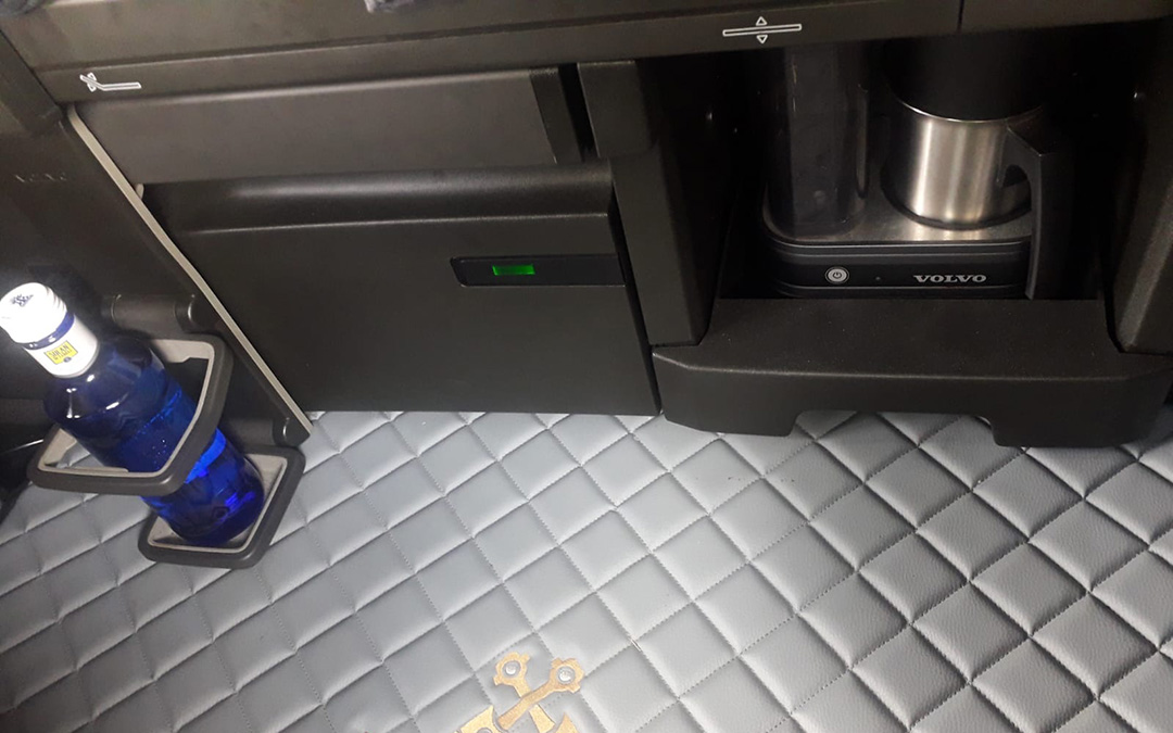 Convenience is also taken care of. My fridge with ice compartment and coffee machine are always to hand so that I’m well supplied while I’m driving.