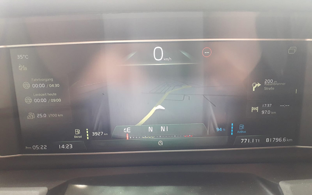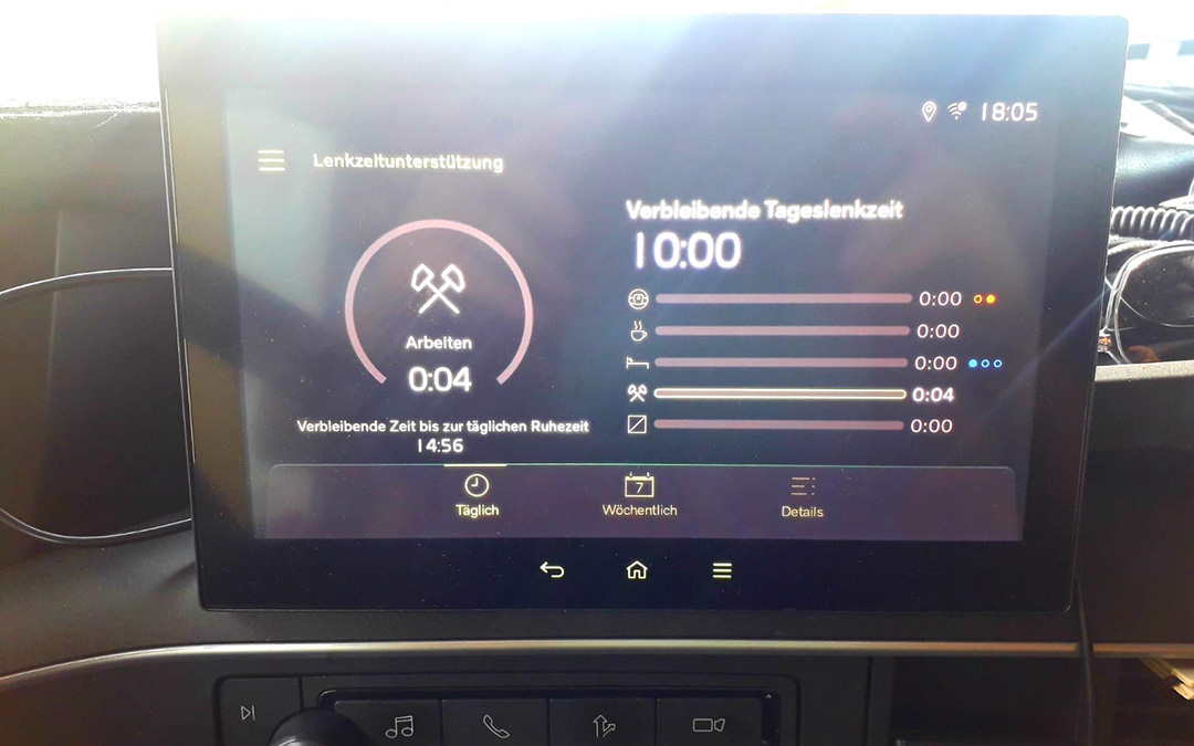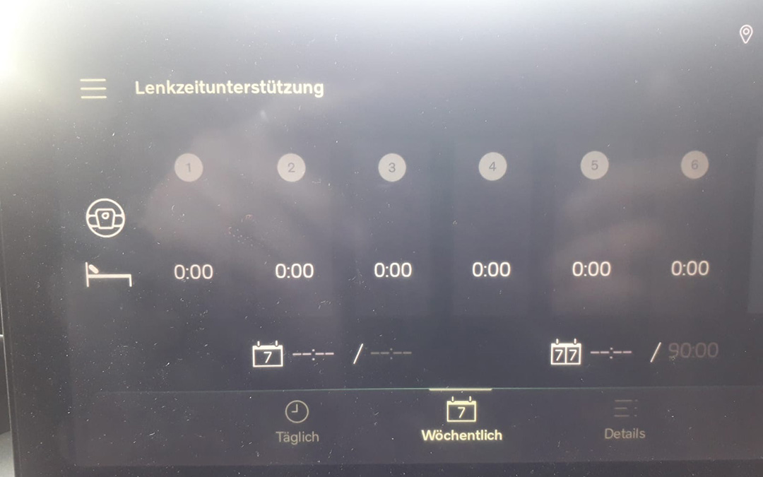 You can see my display settings in the following pictures. At the top, where the 0 is shown and the hard shoulders are displayed, I can see that my side assist is switched on and is keeping me in my lane. In the middle is my digital navigation system. I can also see my fuel gauge, the time, the kilometers driven, my rest breaks and the daily driving time on the display. So I get a summary of how long I drive during the day, how many breaks I have to take and how much shift time is left until the next break. And below that I have an overview of the whole week.