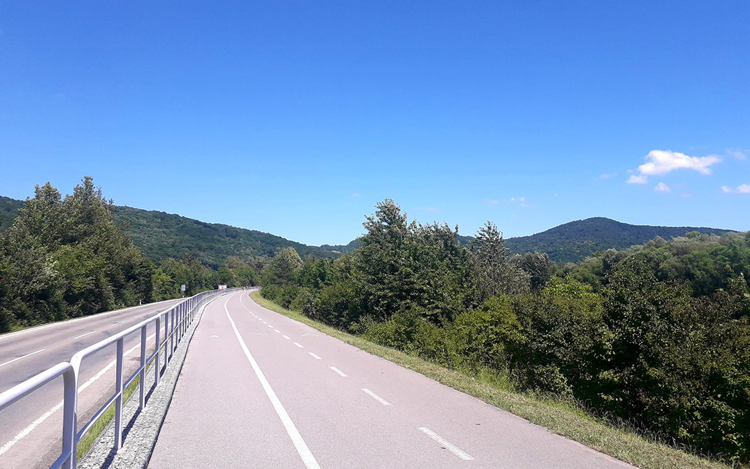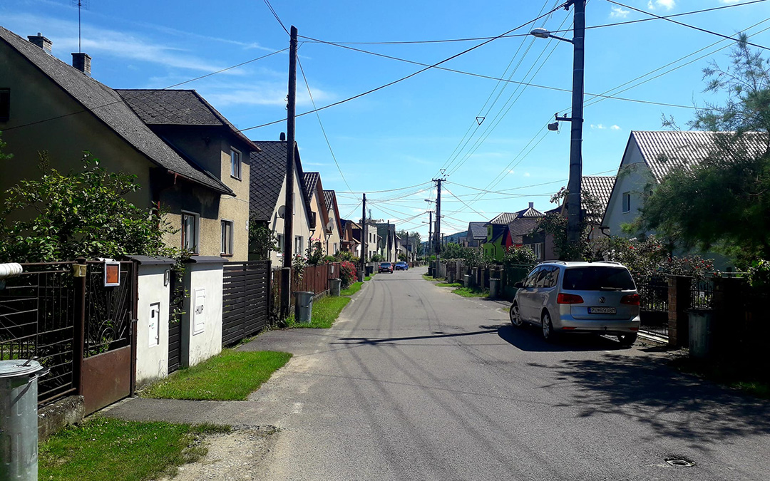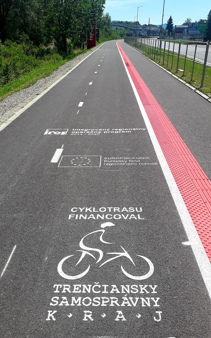 On Friday morning, I set off for Púchov – 160 kilometers lie ahead of me. With no to-dos on my mind, I can concentrate fully on the ride and arrive relaxed in the afternoon. For the last hour, I only ride over land: the roads are narrow and the trees almost lean over onto the road, but the surroundings are something to behold. I find the road markings quite interesting: The roadway is marked with red paint for 150 meters. I took a picture of this for you.