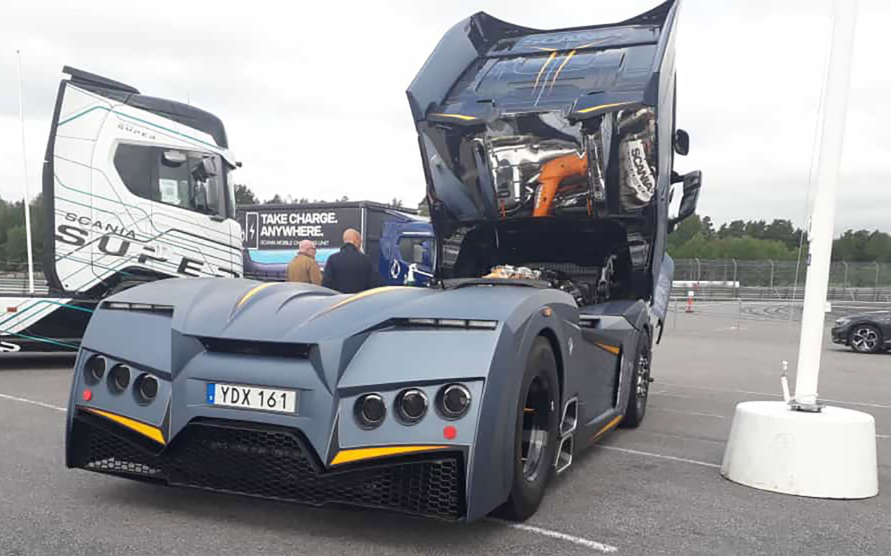 Freddie drives the eTruck, I drive the diesel tractor with the trailer. From Norway we went via Gothenburg first to Boras – and then on to the race track in Mantorp. In between we had to charge the eTruck, but at the first gas station the plug of the charging station did not fit. We then just drove optimistically further into the night and also found quite quickly a gas station where we could stand with both trucks. At the fast charging station, the battery was full again in a good three hours – and Freddie and I just used the time for a nap.