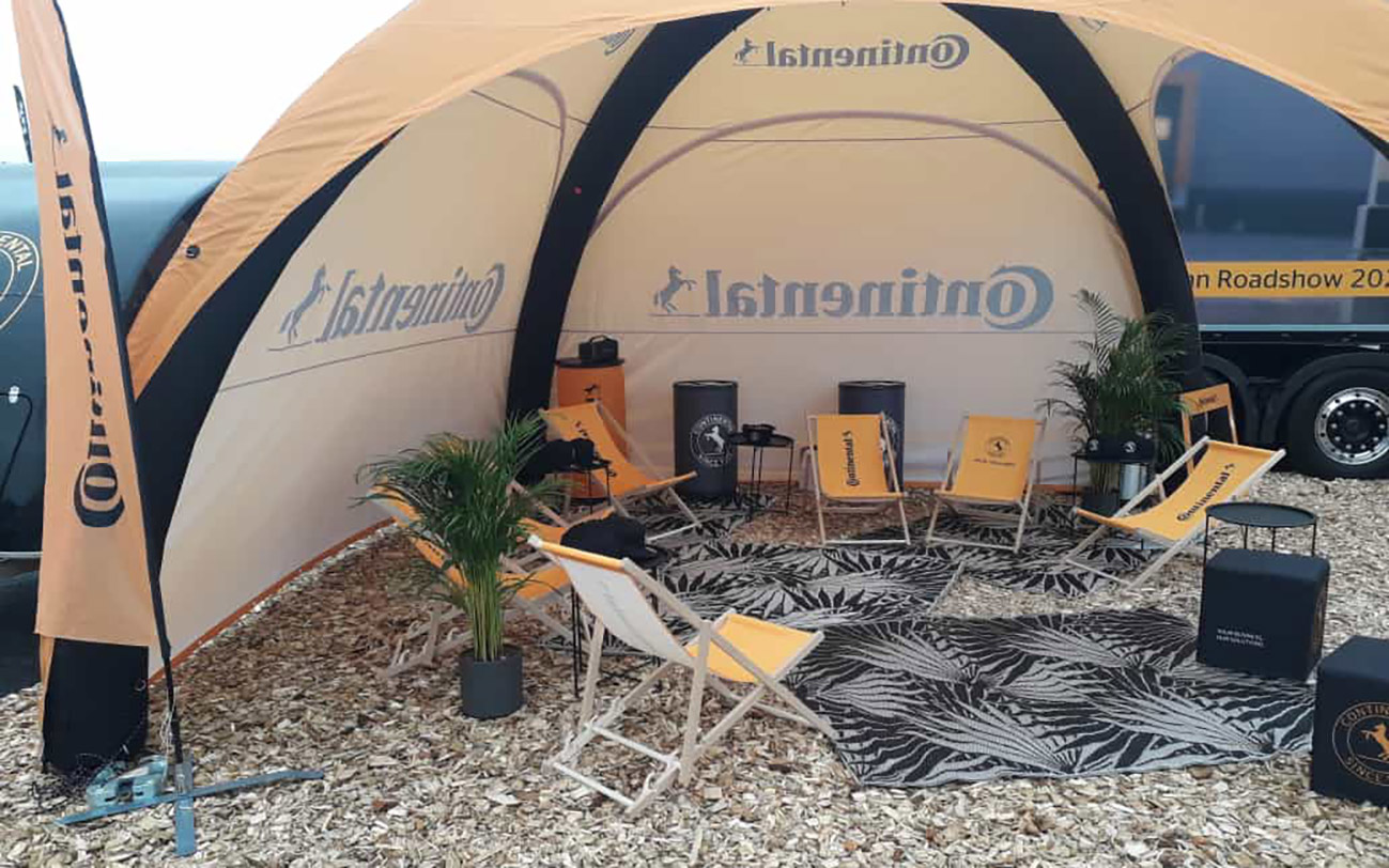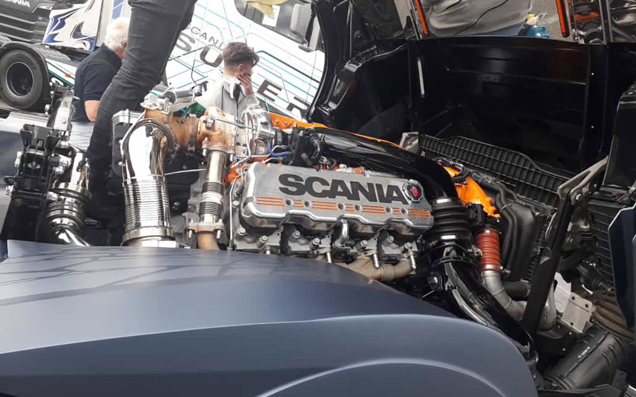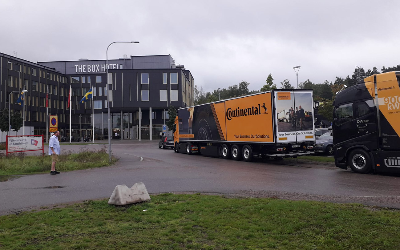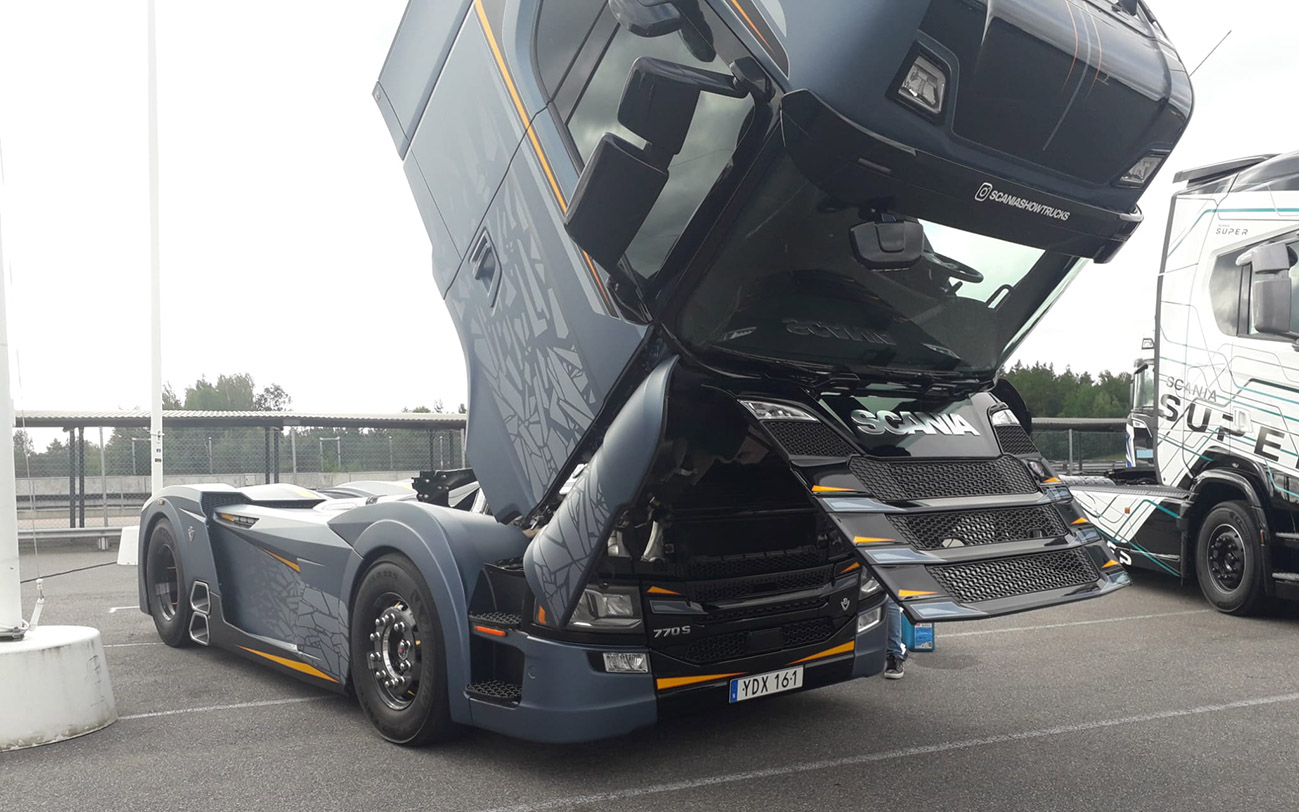 But hey – the weather isn’t a request performance and we’re not made of sugar. Together with my colleagues Freddie from Designwerk and Christian from Continental, we try to bring good humor and lots of information across in our deck chairs and the beach tent. That works out quite well! In addition to the five tire top worlds on the trailer, many people also took a very interested look at the eTruck. And of course Scania, as the Swedish manufacturer, is represented here with a large booth. My favorite traction machine with the blatantly tuned engine, which I already liked so much at the Nürburgring, is also back…