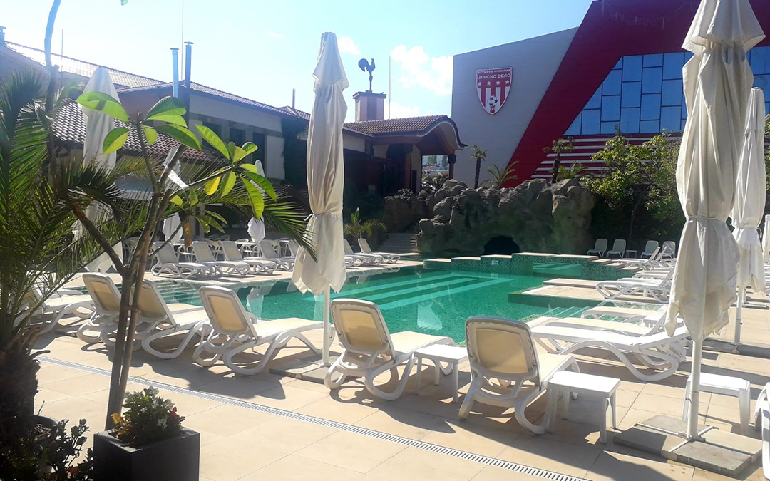 The next day we drove to Sofia for two events. It was an easy drive, only 140 kilometres and all on motorways. The hotel also reminds me a bit of the hotel in Romania. Small villas, wellness centre and the football stadium just around the corner.