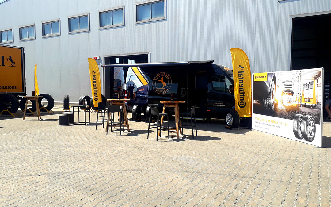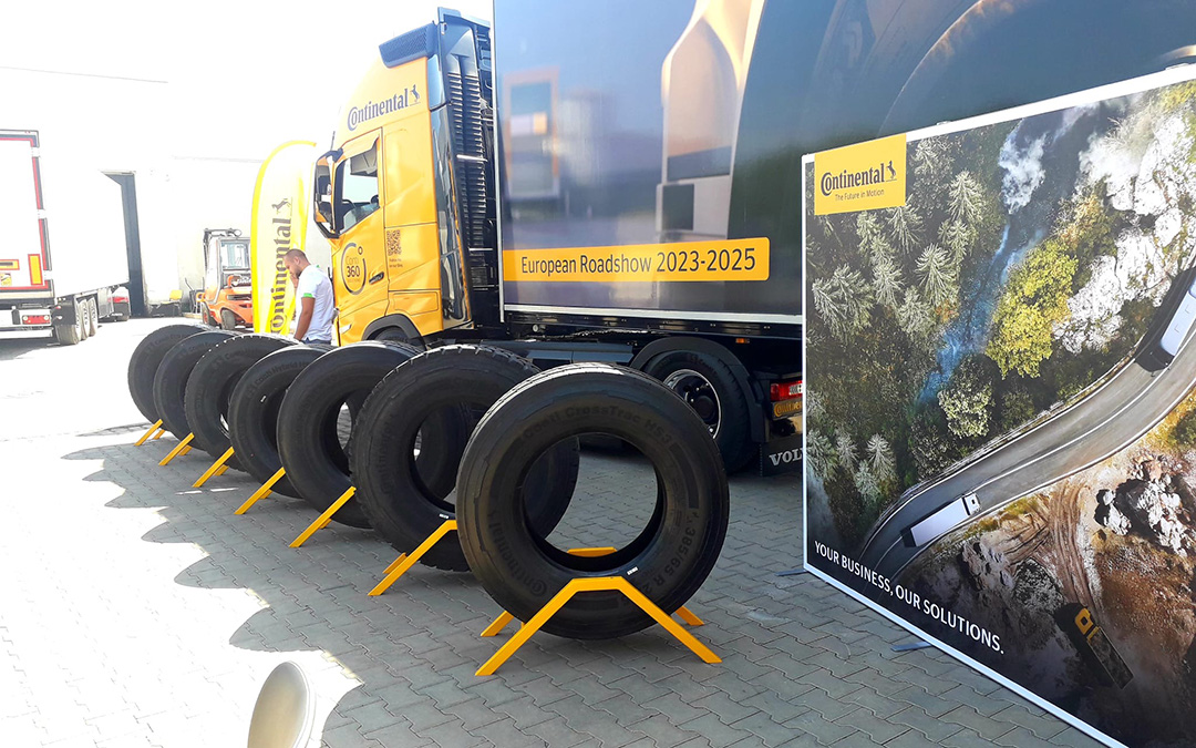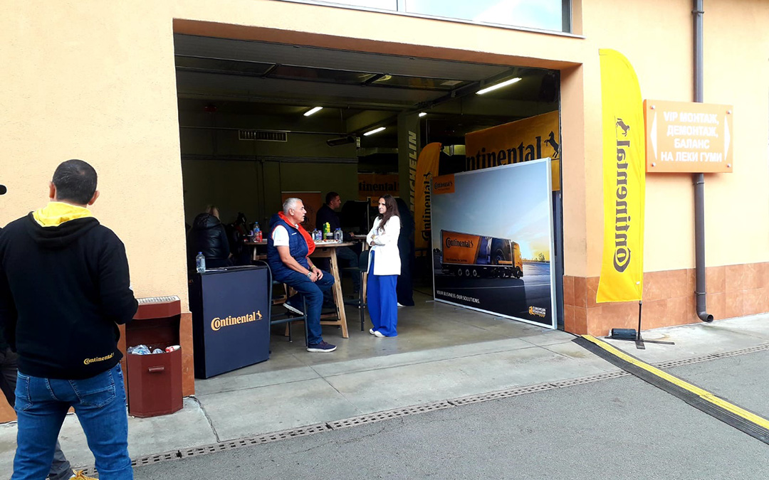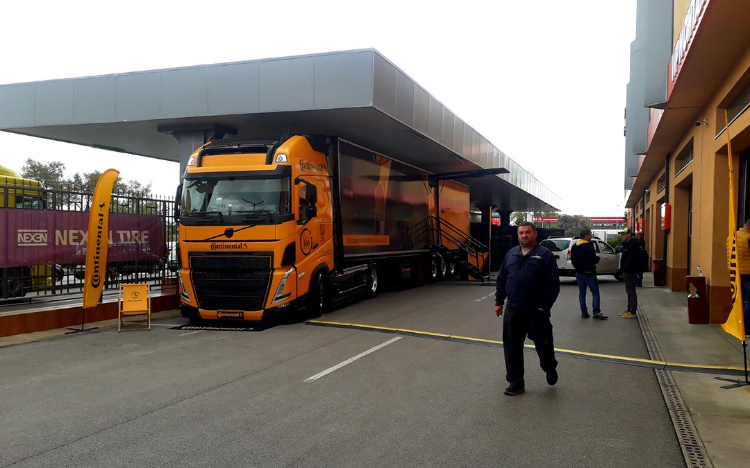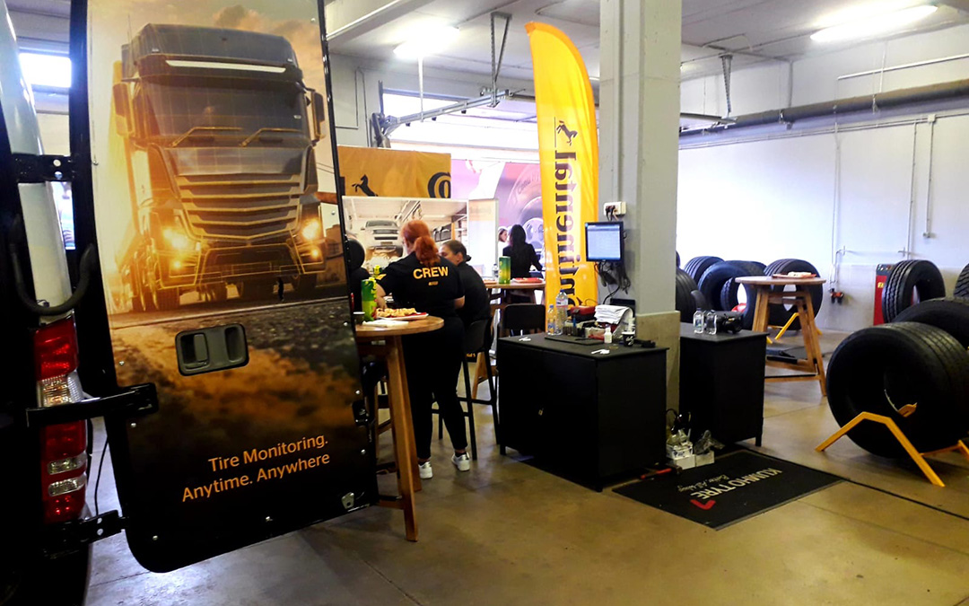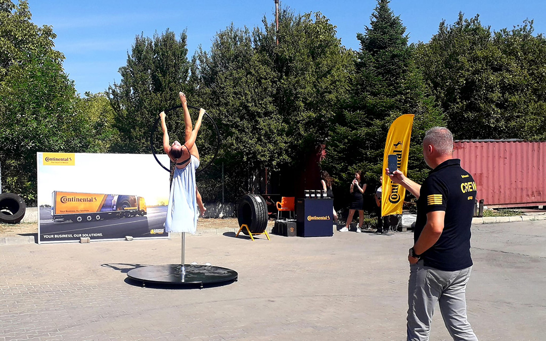 Once we arrive at the venue, it’s time to set up. This time at the tyre wholesaler Medina-Med. The company has a workshop and warehouses with tyres on site. Hauliers are invited, and the show of the day is a gymnastics performance – as always, everything is a bit extravagant.