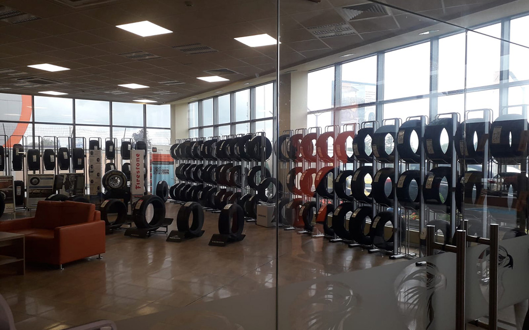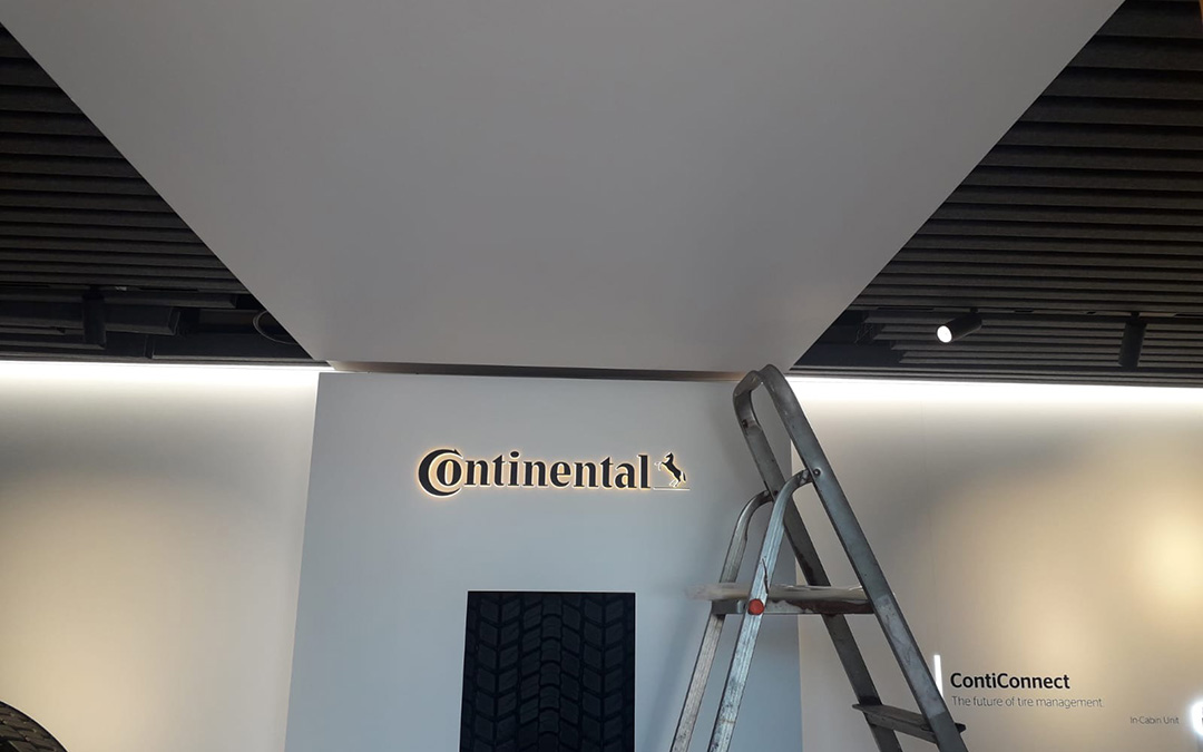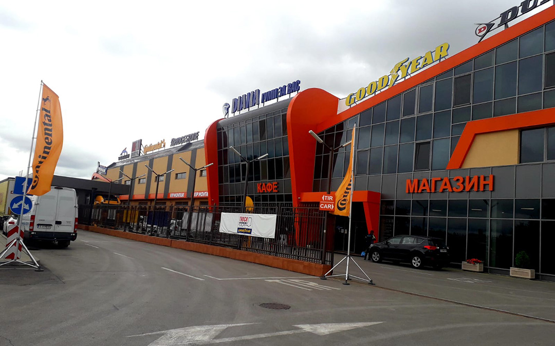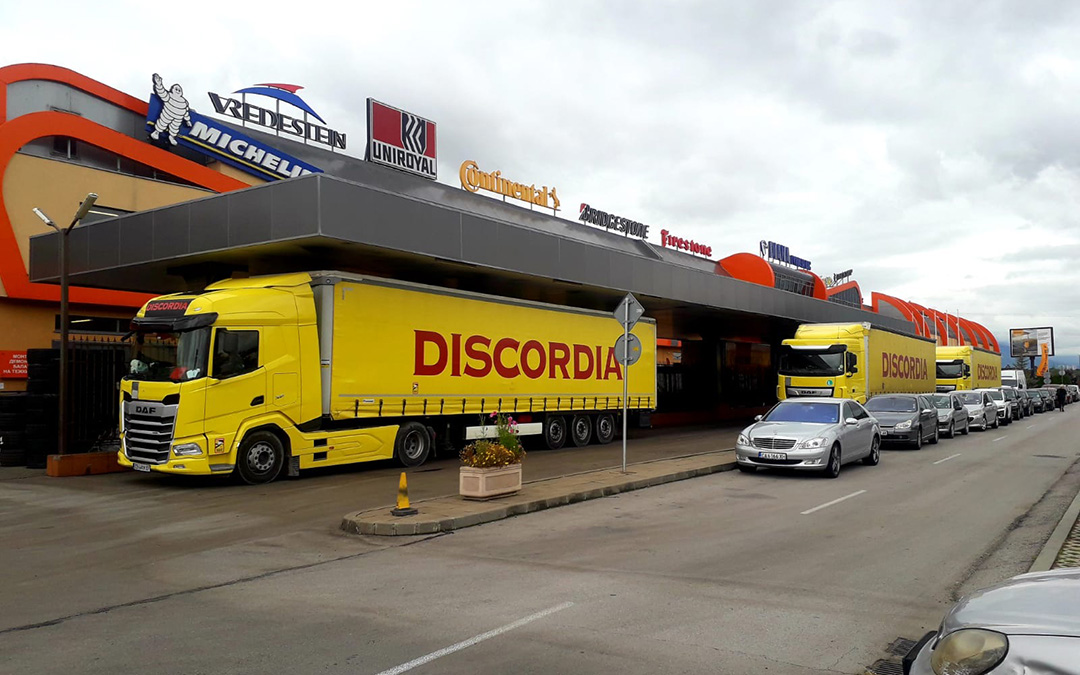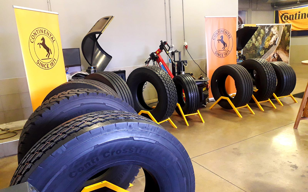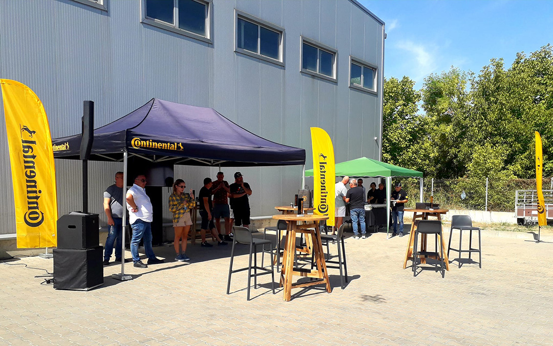 Once we arrive at the venue, it’s time to set up. This time at the tyre wholesaler Medina-Med. The company has a workshop and warehouses with tyres on site. Hauliers are invited, and the show of the day is a gymnastics performance – as always, everything is a bit extravagant.
